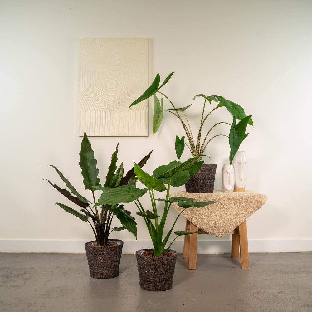 Alocasia Zebrina - Ø19cm - ↕75cm + Alocasia Cucullata - Ø19cm - ↕60cm + Alocasia Lauterbachiana - Ø19cm - ↕75cm