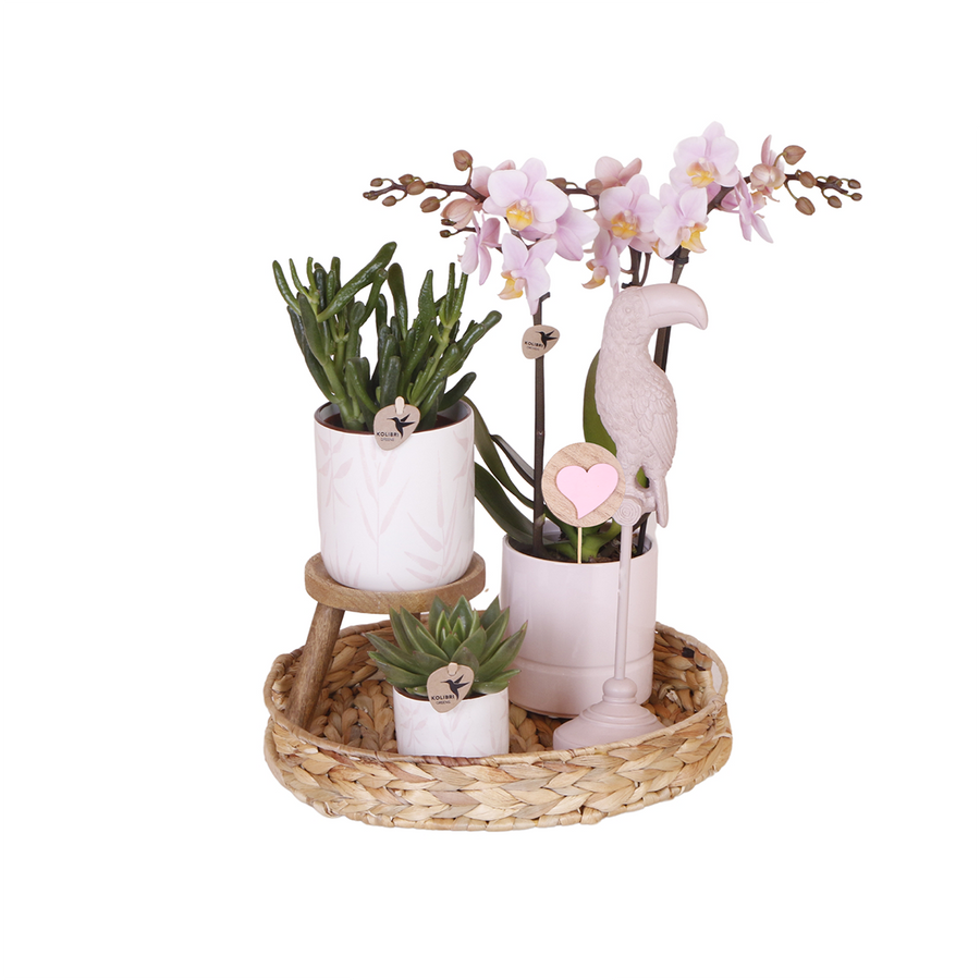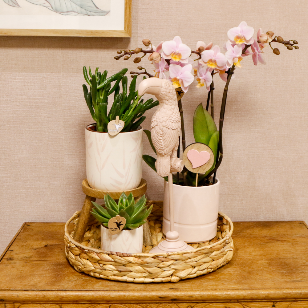 Kolibri Company | Gift set Romantic| Plantenset met roze Phalaenopsis Orchidee en Succulenten incl. keramieken sierpotten