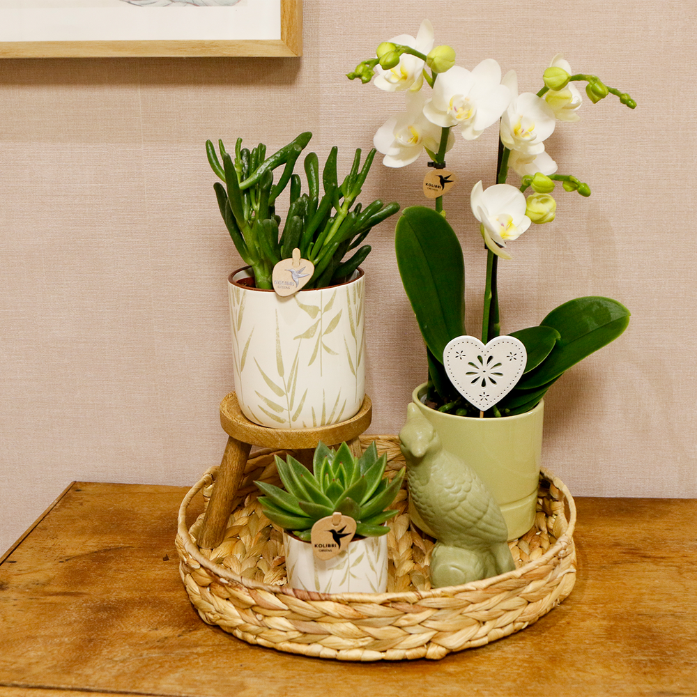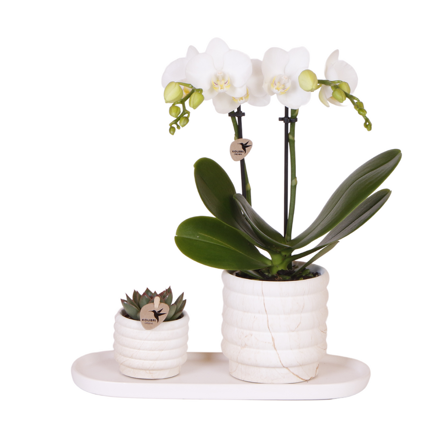 Kolibri Company | Plantenset Le Chic small | Witte Phalaenopsis Orchidee Amabilis en Succulent incl. keramieken sierpotten op crème organisch dienblad