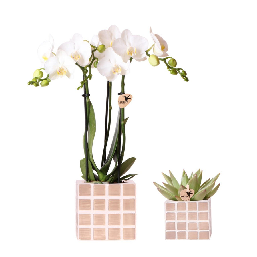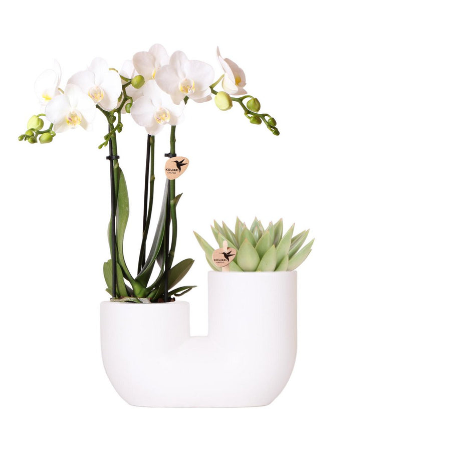 Kolibri Orchids | Set van witte orchidee Amabilis en succulent in Tube sierpot wit - potmaat Ø9cm | bloeiende kamerplant - vers van de kweker