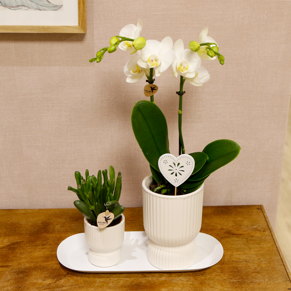 Kolibri Orchids | Plantenset Love wit small| Groene planten met witte Phalaenopsis orchidee in witte sierpotten op wit dienblad