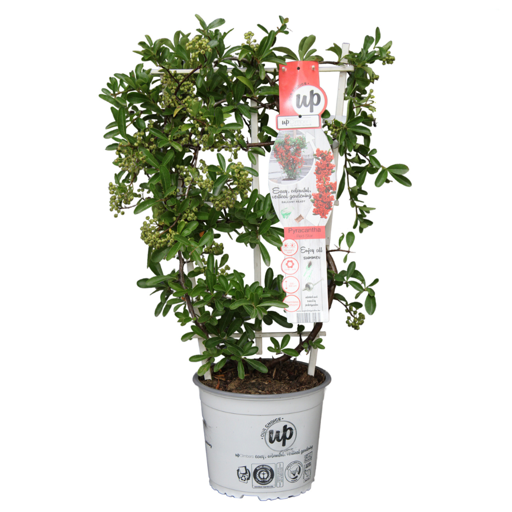 Deze Vuurdoorn Red Star heeft minder doornen dan andere Pyracantha en is wintergroen met rode bessen die september rood kleuren.