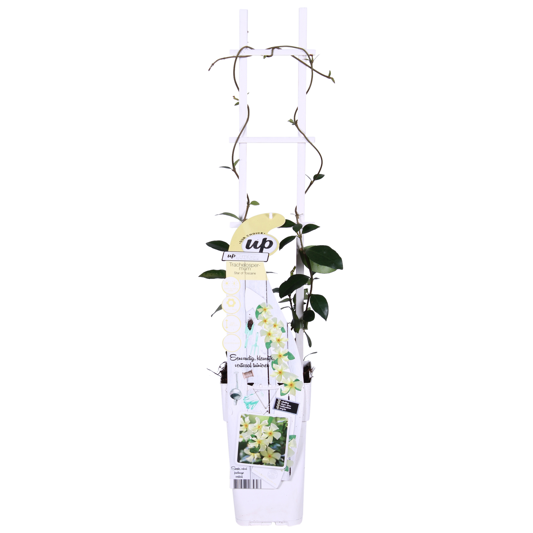 ‘Trachelospermum Star of Toscana’ ook wel sterjasmijn genoemd door zijn zachtgele, stervormige bloemen. Het is een Mediterrane wintergroene klimplant en winterhard tot wel -10?C. De uitbundige bloeitijd is van begin juni tot eind augustus, in deze periode verspreiden de bloemen een heerlijke zoete geur. De klimplant heeft ovale, donkergroene bladeren en ondersteuning nodig van een klimrek of schutting om goed te kunnen groeien. De nieuw uitlopende takken van deze sterjasmijn krullen langs een gaaswerk of schutting mooi omhoog. De beste plaats is zonnig tot halfschaduw en uit de volle wind. De sterjasmijn kan in de volle grond geplant worden in een normale voedselrijke grond. Ook in een ruime pot op het terras of balkon groeit de sterjasmijn goed.