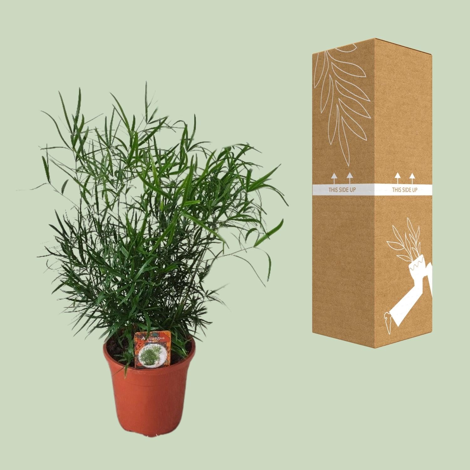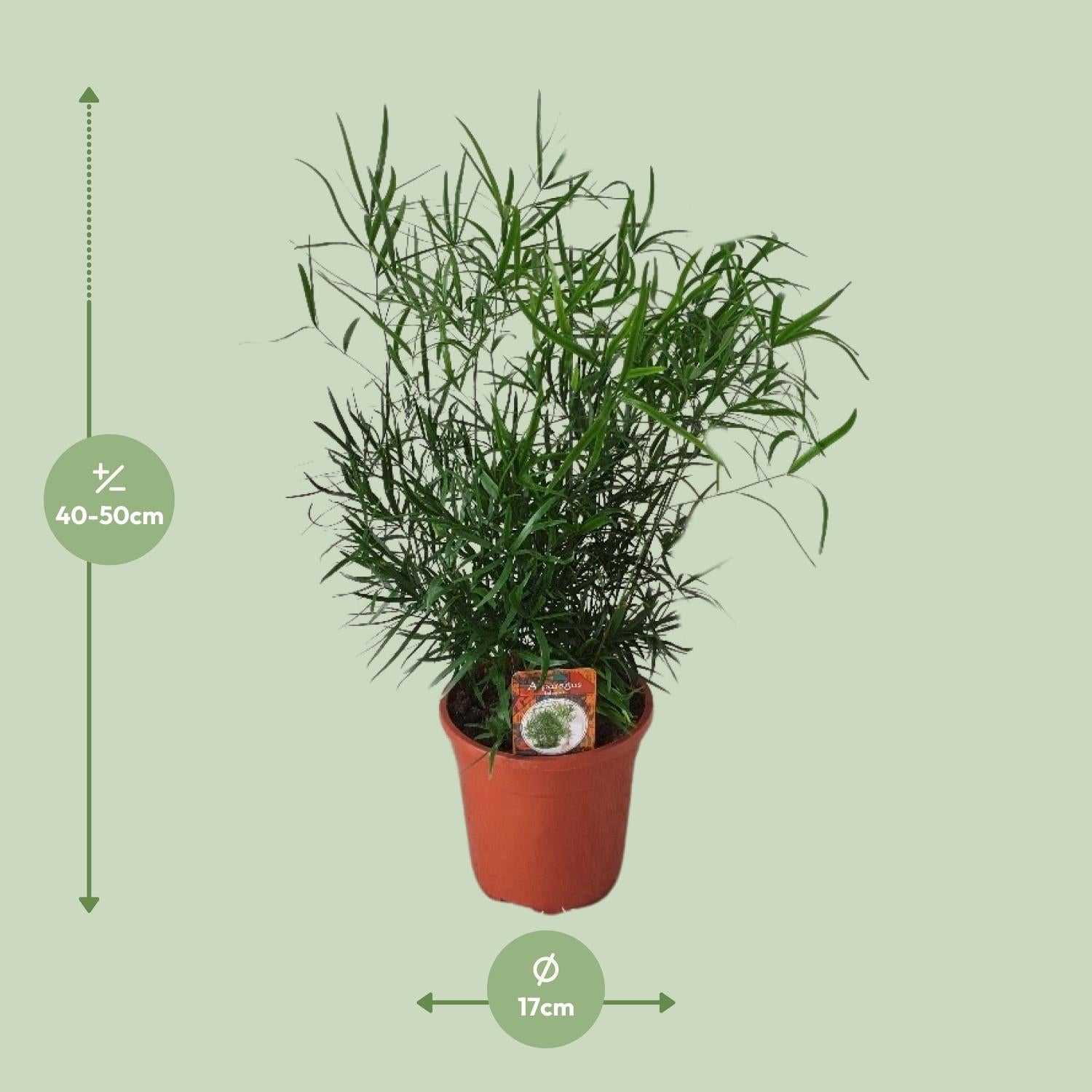Asparagus falcatus, ook wel bekend als Asparagusvaren, is een kamerplant met een fascinerende oorsprong. Oorspronkelijk afkomstig uit Zuid-Afrika, toont deze elegante varenachtige plant delicate, verenachtige bladeren die gracieus naar beneden cascadeert, waardoor het een perfecte toevoeging is aan je collectie binnenplanten. De Asparagusvaren staat bekend om zijn luchtzuiverende eigenschappen, waardoor de sfeer in huis verbetert en een vleugje natuurlijke schoonheid toevoegt. De prachtige Asparagus falcatus is een must-have toevoeging aan elke verzameling van kamerplanten. Deze unieke plant gedijt goed in Halfschaduw omstandigheden, waardoor het perfect is voor mensen die beperkte toegang hebben tot direct zonlicht. Met zijn delicate, veerachtige bladeren en gebogen stelen, voegt het zeker een vleugje elegantie toe aan jouw ruimte. Om deze schoonheid gelukkig te houden, geef je hem één keer per week water en zorg je ervoor dat de grond gelijkmatig vochtig blijft. Haal vandaag nog de Asparagus falcatus in huis en geniet van zijn moeiteloze schoonheid!Leuk feitje: Asparagus falcatus, ook wel bekend als Sicklethorn of Ming Fern, is een prachtige plant die inheems is in Zuid-Afrika. De veerachtige, weelderige bladeren voegen een vleugje elegantie toe aan elke ruimte. Echter, ik wil je er vriendelijk aan herinneren dat deze plant puur decoratief is en niet eetbaar. Weersta dus de verleiding om het in je favoriete roerbakgerecht of salade te gooien! Geniet van de schoonheid van Asparagus falcatus, maar omarm zijn rol als niet-eetbare, betoverende kamerplant die levendig groen naar binnen brengt. Ga gerust verder en laat zijn decoratieve charme je ruimte betoveren!De Asparagus falcatus plant heeft een potmaat van 17 cm, waardoor hij geschikt is voor kleinere ruimtes of binnentuinen.Deze plant groeit meestal tot ongeveer 50 cm hoogte, waardoor het een geweldige toevoeging is aan tafelbladen of planken.Asparagus falcatus staat ook bekend als Asparagus Varen, vanwege zijn varenachtige bladeren en verenachtige uiterlijk.Deze plant gedijt goed op een plek met halfschaduw, waardoor het een ideale keuze is voor gebieden die gedurende de dag gefilterd zonlicht ontvangen.Leuke feit: Asparagus is eigenlijk geen varen of echte varen, maar eerder een lid van het geslacht Asparagus in de familie Asparagaceae.