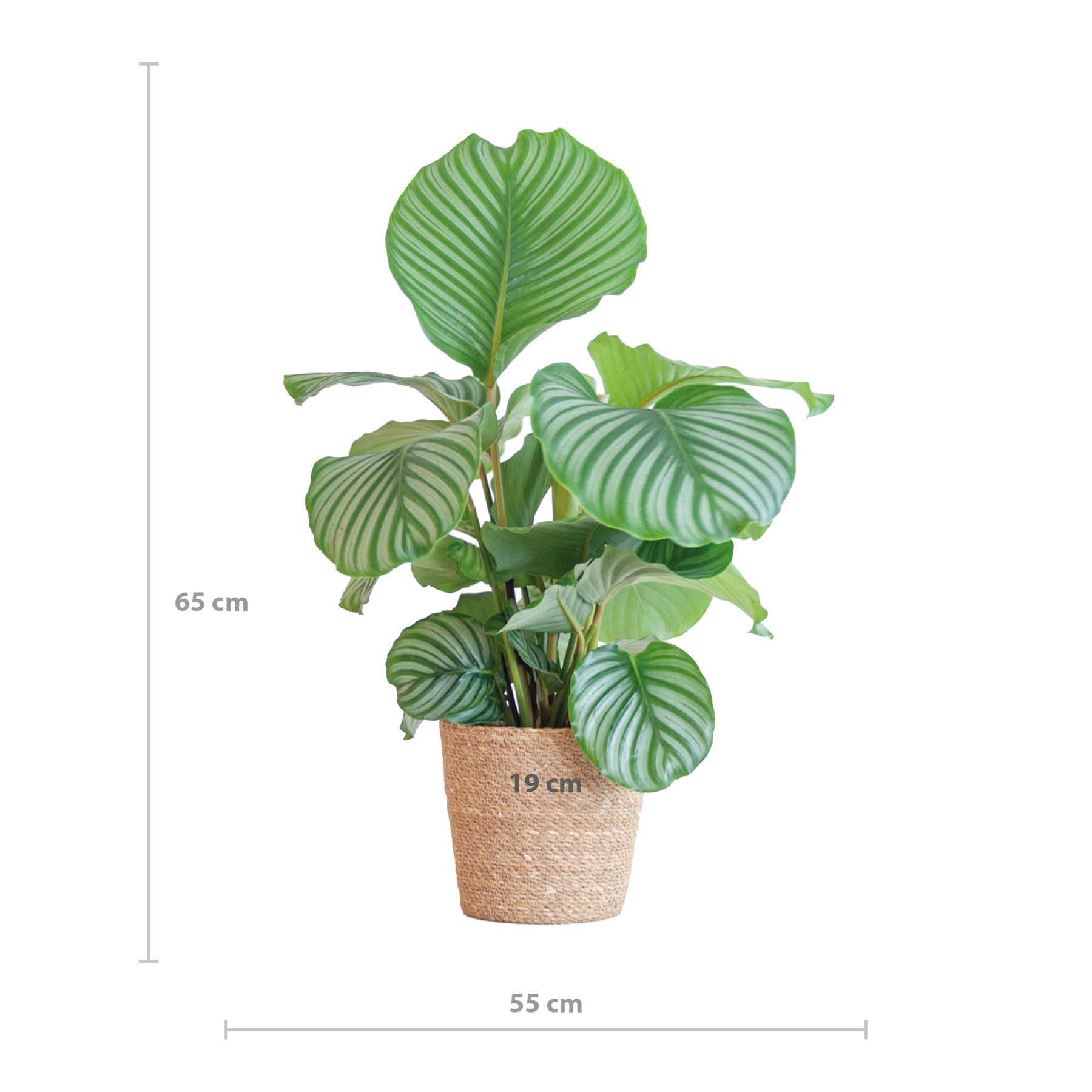 De Calathea orbifolia is een prachtige groene kamerplant met luchtzuiverende eigenschappen! Haar indrukwekkende, grote bladeren zijn heldergroen met mintgroene strepen, wat een knallend effect geeft. Deze plant is een visueel spektakel met zijn opvallende kleuren! De Calathea is erg geliefd en vaak te vinden in woonbladen en op sociale media. Een interessant weetje is dat de bladeren van de Calathea 's nachts sluiten en 's ochtends weer opengaan! Soms hoor je 's avonds het ritselende geluid van deze kamerplant.
