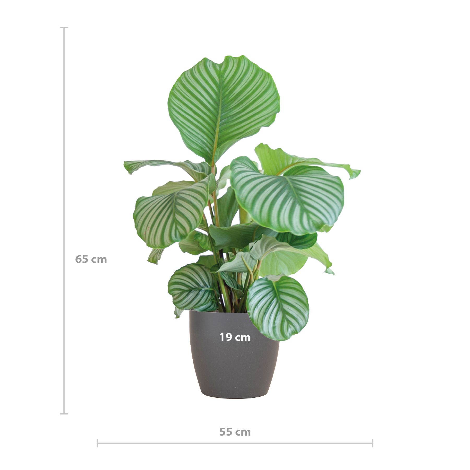 De Calathea orbifolia is een prachtige groene kamerplant met luchtzuiverende eigenschappen! Haar indrukwekkende, grote bladeren zijn heldergroen met mintgroene strepen, wat een knallend effect geeft. Deze plant is een visueel spektakel met zijn opvallende kleuren! De Calathea is erg geliefd en vaak te vinden in woonbladen en op sociale media. Een interessant weetje is dat de bladeren van de Calathea 's nachts sluiten en 's ochtends weer opengaan! Soms hoor je 's avonds het ritselende geluid van deze kamerplant.
