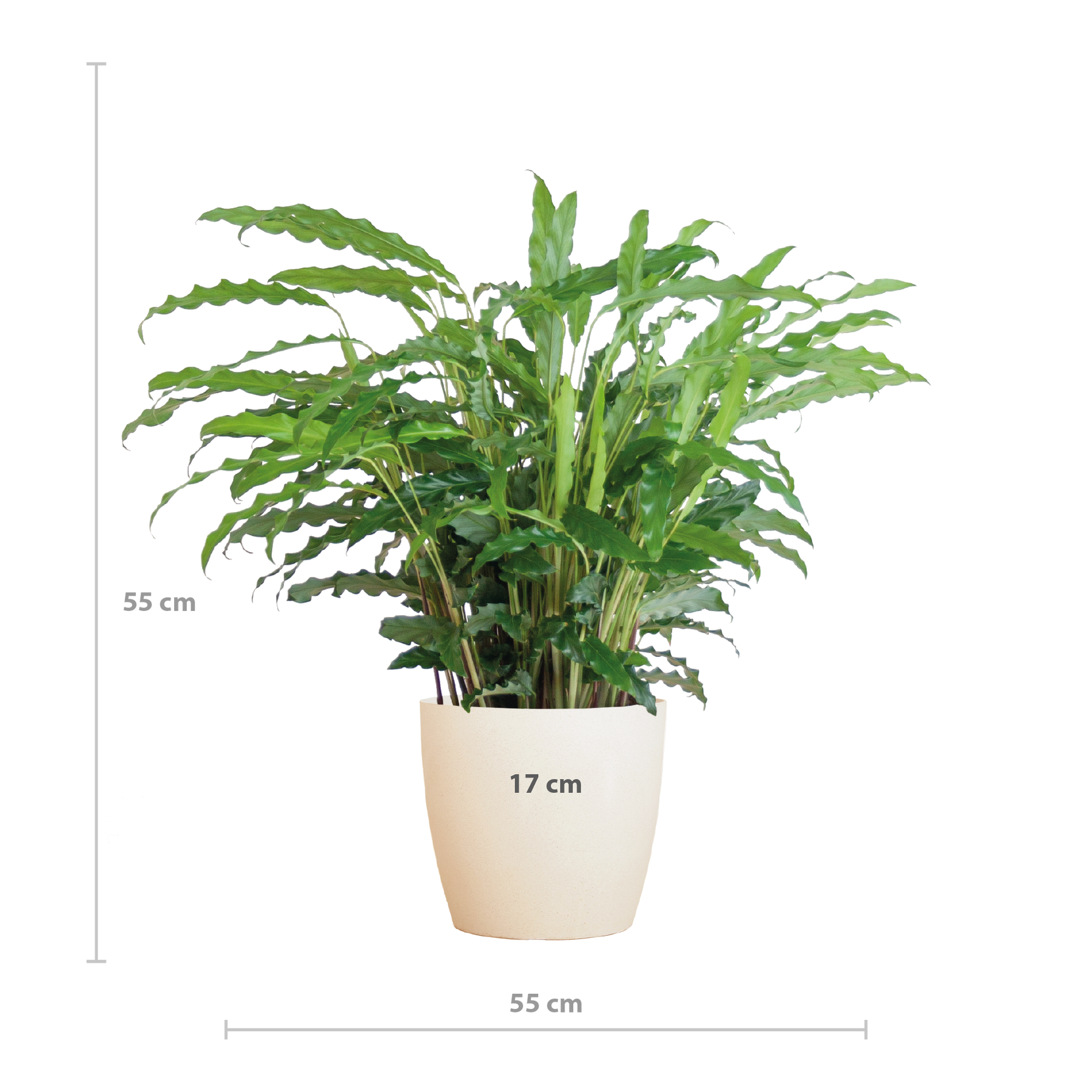 De Calathea Rufibarba is een opvallende groene kamerplant met lange, dunne bladeren die bekend staan om hun fluweelachtige textuur. Deze bijzondere textuur heeft de plant de bijnaam ‘fluwelen Calathea’ opgeleverd. Deze kamerplant komt oorspronkelijk uit Zuid-Amerika, waar hij groeit in de warme en vochtige omgeving van het regenwoud. De Calathea Rufibarba is niet alleen geliefd vanwege zijn unieke uiterlijk, maar ook omdat hij bekend staat om zijn luchtzuiverende eigenschappen. Hij helpt de lucht in huis schoon te houden door schadelijke stoffen op te nemen en om te zetten in zuurstof. ‘Rufibarba’ betekent ‘harige veren’, wat verwijst naar de zachte, haartjesachtige structuur op de onderkant van de bladeren. Deze structuur is niet alleen mooi, maar helpt de plant ook om vocht beter vast te houden. De verzorging van deze Calathea is relatief eenvoudig, wat hem een uitstekende keuze maakt voor zowel beginners als meer ervaren plantenliefhebbers. Hij heeft een voorkeur voor een plekje in de halfschaduw en houdt van een regelmatige, maar matige watergift. Geleverd samen met een Viber pot. De pot is gemaakt van bioplastic met olifantengras van Nederlandse bodem. De pot is biologisch afbreekbaar en natuurlijk gekleurd door krijt. Door de lichte natuurlijke kleur past deze pot in verschillende interieurs.
