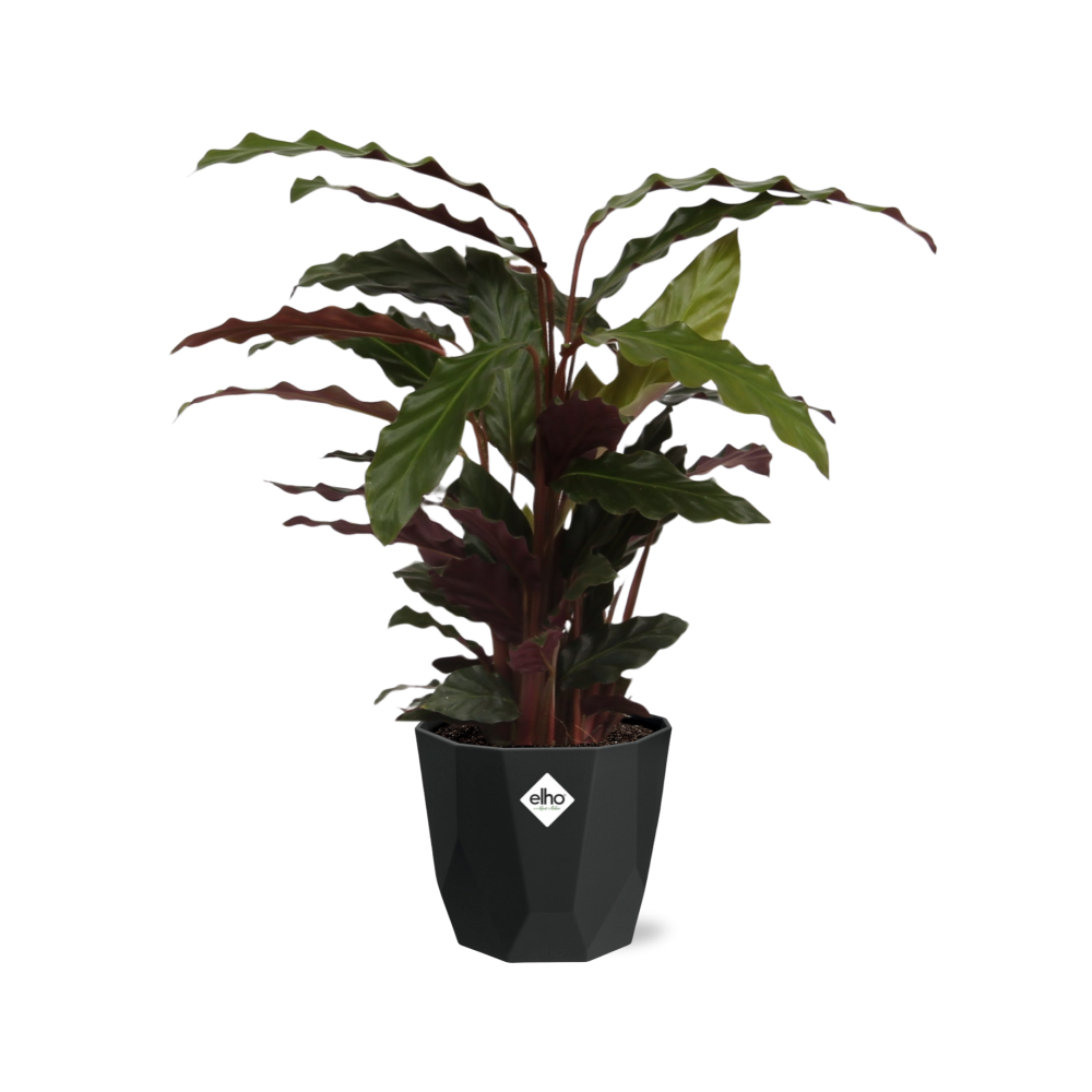 Calathea-planten hebben een plek in halfschaduw of schaduw nodig om goed te gedijen, omdat ze de voorkeur geven aan indirect zonlicht. Regelmatig water geven is nodig om de grond constant vochtig te houden, maar niet doorweekt. Het is het beste om goed doorlatende grond te gebruiken die vocht vasthoudt, zoals een mengsel van veenmos en perliet. Het wordt aanbevolen om de Calathea-plant elke maand tijdens het groeiseizoen te bemesten, met behulp van een uitgebalanceerde vloeibare meststof verdund tot halve sterkte. Het is belangrijk om de instructies op het meststoflabel te volgen en overbemesting te vermijden, omdat dit de plant kan beschadigen. Deze plant wordt geleverd in een decoratieve pot en voegt schoonheid toe aan elke binnenruimte.