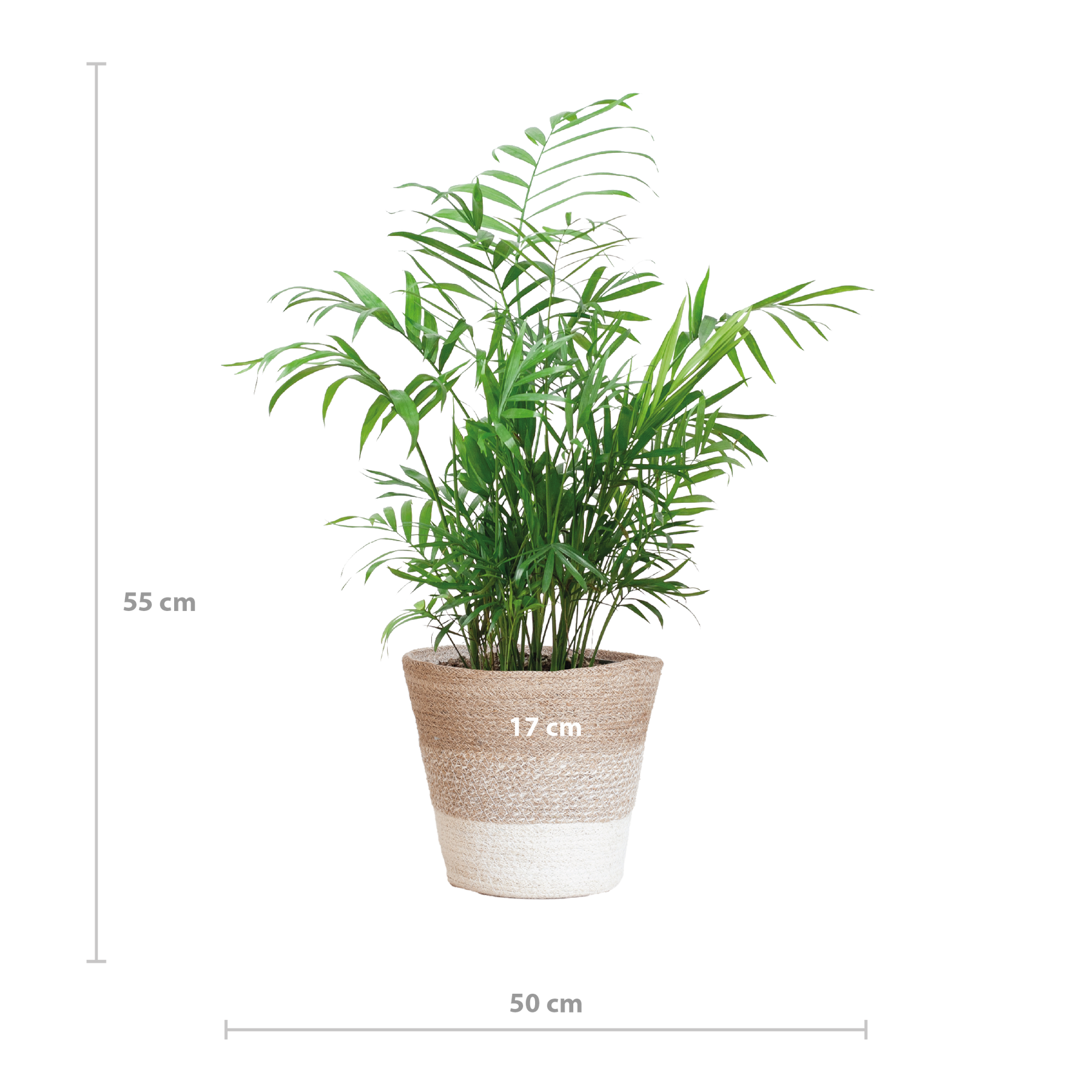 De Chamaedorea Elegans, ook wel bekend als de Mexicaanse Dwergpalm, is een charmante groene kamerplant met elegante, veerachtige bladeren. Deze palm heeft geen bloemen, maar zijn frisgroene bladeren maken hem tot een aantrekkelijke toevoeging aan elk interieur. Deze kamerplant komt oorspronkelijk uit de vochtige, schaduwrijke ondergroei van Zuid-Amerikaanse bossen. Hier groeit hij onder het dichte bladerdak van hogere bomen, wat hem perfect maakt voor plekken in huis met indirect licht. De Latijnse naam ‘Chamaedorea’ is afgeleid van de Griekse woorden ‘chamai’, wat ‘op de grond’ betekent en ‘dorea’, wat ‘gift’ betekent. ‘Elegans’ verwijst naar de elegante uitstraling van de plant. Samen benadrukken deze namen de bescheiden, maar sierlijke aard van deze palm. De verzorging van deze Mexicaanse Dwergpalm is vrij eenvoudig, wat hem een uitstekende keuze maakt voor zowel beginnende als ervaren plantenliefhebbers. Hij heeft niet veel water nodig en kan goed overweg met verschillende lichtomstandigheden, zolang hij maar niet in direct zonlicht staat. De Lissabon plantenmand is een stijlvolle, duurzamer geproduceerde mand van jute. Met zijn natuurlijke tinten is deze plantenmand goed te combineren met allerlei soorten kamerplanten. Deze Terima Kasih plantenmand is duurzamer en verantwoordelijk geproduceerd. De mand is gemaakt van jute, een biologisch afbreekbare plant, die met de hand is gevlochten. Bij de productie worden geen fossiele brandstoffen gebruikt.Terima Kasih zorgt ervoor dat mensen in Azië een goede baan kunnen krijgen. Medewerkers worden jaarrond van werk voorzien, krijgen twee verse maaltijden per dag én moeders hebben aangepaste werktijden.