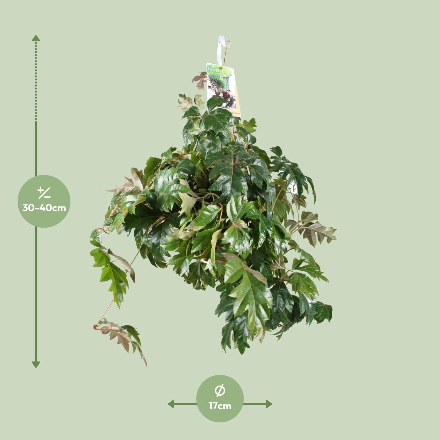 Maak kennis met Cissus Rhombifolia Ellen Danica, een betoverende kamerplant die ook wel de Kangaroo Vine genoemd wordt. Afkomstig uit de tropische bossen van Zuid-Amerika, heeft deze buitengewone klimplant weelderig groen blad en voegt een vleugje elegantie toe aan elke leefruimte. Met zijn krachtige groei en vermogen om zich aan te passen aan verschillende lichtomstandigheden, gedijt hij moeiteloos binnenshuis. Cissus Rhombifolia Ellen Danica is de perfecte keuze voor plantenliefhebbers die op zoek zijn naar een onderhoudsarme, visueel prachtige toevoeging aan hun collectie. Transformeer vandaag nog je huis met deze SEO-geoptimaliseerde, milieuvriendelijke kamerplant. Op zoek naar een prachtige toevoeging aan jouw binnentuin? Zoek niet verder dan Cissus rhombifolia Ellen Danica! Deze mooie plant gedijt goed op een plek met halfschaduw of een combinatie van halfschaduw en schaduw. Met zijn delicate wijnachtige bladeren voegt het een prachtige touch toe aan elke ruimte. Om optimale groei te garanderen, geef deze plant eens per week water en laat de grond tussen bewateringen door opdrogen. Met minimaal onderhoud zal deze Cissus rhombifolia Ellen Danica gedijen en het middelpunt worden van jouw botanische paradijs. Bestel vandaag nog de jouwe en til jouw binnentuin naar nieuwe hoogten!"Cissus rhombifolia 'Ellen Danica', ook bekend als 'Grape Ivy', is een prachtige kamerplant die weelderig groen brengt in elke ruimte. Met zijn levendige, hartvormige bladeren en hangende ranken voegt het een vleugje elegantie toe aan elke kamer. Deze mooie plant is populair vanwege zijn luchtzuiverende eigenschappen, omdat het helpt om de binnenlucht te reinigen en te verfrissen. Het is echter belangrijk om op te merken dat Cissus rhombifolia Ellen Danica puur decoratief is en niet eetbaar. Zijn prachtige uiterlijk is het beste te genieten door zijn visuele charme te waarderen, waardoor het een perfecte keuze is om uw leef- of werkgebied op te fleuren."Cissus rhombifolia Ellen Danica is een populaire kamerplant met een potmaat van 17 cm, waardoor hij geschikt is voor kleinere ruimtes of tafeldisplays.- Deze variëteit groeit meestal tot een hoogte van ongeveer 35 cm, waardoor het een compacte en beheersbare plant is voor binnenomgevingen.- Cissus rhombifolia staat ook bekend onder de naam Kangaroo Vine, vanwege zijn vermogen om elegant te klimmen en te draperen, als een wijnstok.- Deze plant gedijt goed in omgevingen met indirect zonlicht of gedeeltelijke schaduw, waardoor het ideaal is voor gebieden met gefilterd licht.- Leuk feit: Cissus rhombifolia Ellen Danica wordt beschouwd als een relatief onderhoudsarme plant, waardoor het een goede keuze is voor beginners of drukbezette mensen die wat groen willen toevoegen aan hun ruimte.