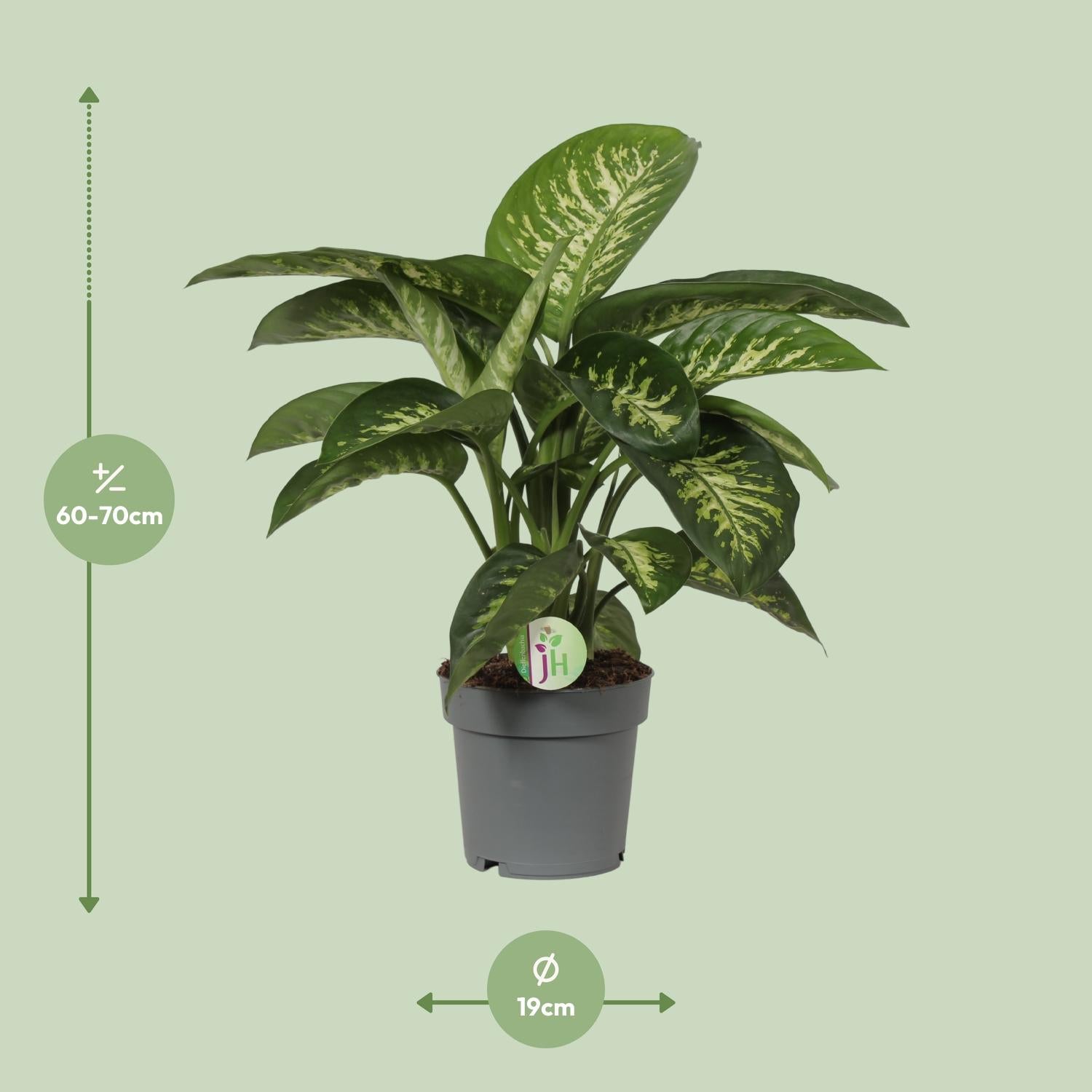Maak kennis met Dieffenbachia Reeva, een prachtige kamerplant die een vleugje elegantie toevoegt aan elke ruimte. Ook wel bekend als Dieffenbachia, komt deze weelderige plant oorspronkelijk uit tropische regio's en geeft uw omgeving een levendige en exotische sfeer. Met zijn grote, glanzende bladeren met unieke patronen gedijt Dieffenbachia Reeva goed in omstandigheden met weinig licht, waardoor het perfect past in elke binnenruimte. Verhoog uw leefruimte met deze SEO-geoptimaliseerde potplant, gegarandeerd om uw huis of kantoor moeiteloos te transformeren in een weelderige oase. Maak kennis met Dieffenbachia Reeva, een prachtige toevoeging aan jouw collectie kamerplanten. Deze opvallende bladplant gedijt goed op een plek met halfschaduw, waardoor hij perfect is voor gezellige hoekjes in jouw huis. Met zijn levendige bladeren en natuurlijke luchtzuiverende eigenschappen brengt Dieffenbachia Reeva leven en frisheid in elke ruimte. Om hem gelukkig en gezond te houden, geef je deze schoonheid slechts één keer per week water en laat je de bovenlaag tussen de gietbeurten door uitdrogen. Makkelijk in onderhoud en visueel indrukwekkend, Dieffenbachia Reeva is de perfecte keuze voor elke plantenliefhebber. Bestel die van jou nu en breng de schoonheid van de natuur naar binnen!Wist je dat Dieffenbachia, ook bekend als de "domme kaneel", zijn naam heeft gekregen van de botanicus Johann Dieffenbach, die als eerste zijn unieke kenmerken heeft herkend? Deze tropische plant, vaak te vinden in huishoudens als een decoratieve schoonheid, brengt de natuur binnenshuis met zijn opvallende bontgekleurde bladeren. Met zijn magische vermogen om de lucht te zuiveren, voegt het een vleugje elegantie toe aan elke ruimte. Onthoud wel dat terwijl Dieffenbachia de sfeer verbetert, het niet bedoeld is om te worden gegeten. Bewonder dus zijn weelderige bladeren, koester zijn betoverende aanwezigheid, maar laat het onaangeroerd, terwijl het dient als een prachtige decoratieve verrukking!Dieffenbachia Reeva heeft een potmaat van 19 cm, waardoor het perfect past bij kleine ruimtes of tafelbladen.Met een hoogte van ongeveer 65 cm voegt Dieffenbachia Reeva verticaliteit toe aan elke binnenruimte, waardoor een elegante en opvallende presentatie ontstaat.Dieffenbachia, ook bekend als Dieffenbachia, is een populaire keuze onder plantenliefhebbers vanwege zijn opvallende bladeren en luchtzuiverende eigenschappen.Deze plant gedijt in halfschaduw, wat verwijst naar een plek met gedeeltelijke schaduw, waardoor hij zich kan aanpassen aan verschillende lichtomstandigheden in uw huis of kantoor.Leuk feit: Dieffenbachia planten worden soms "domme stok" genoemd omdat hun bladeren calciumoxalaatkristallen bevatten, wat tijdelijke gevoelloosheid veroorzaakt bij kauwen of inslikken. Het is het beste om ze uit de buurt van nieuwsgierige huisdieren of kinderen te houden.