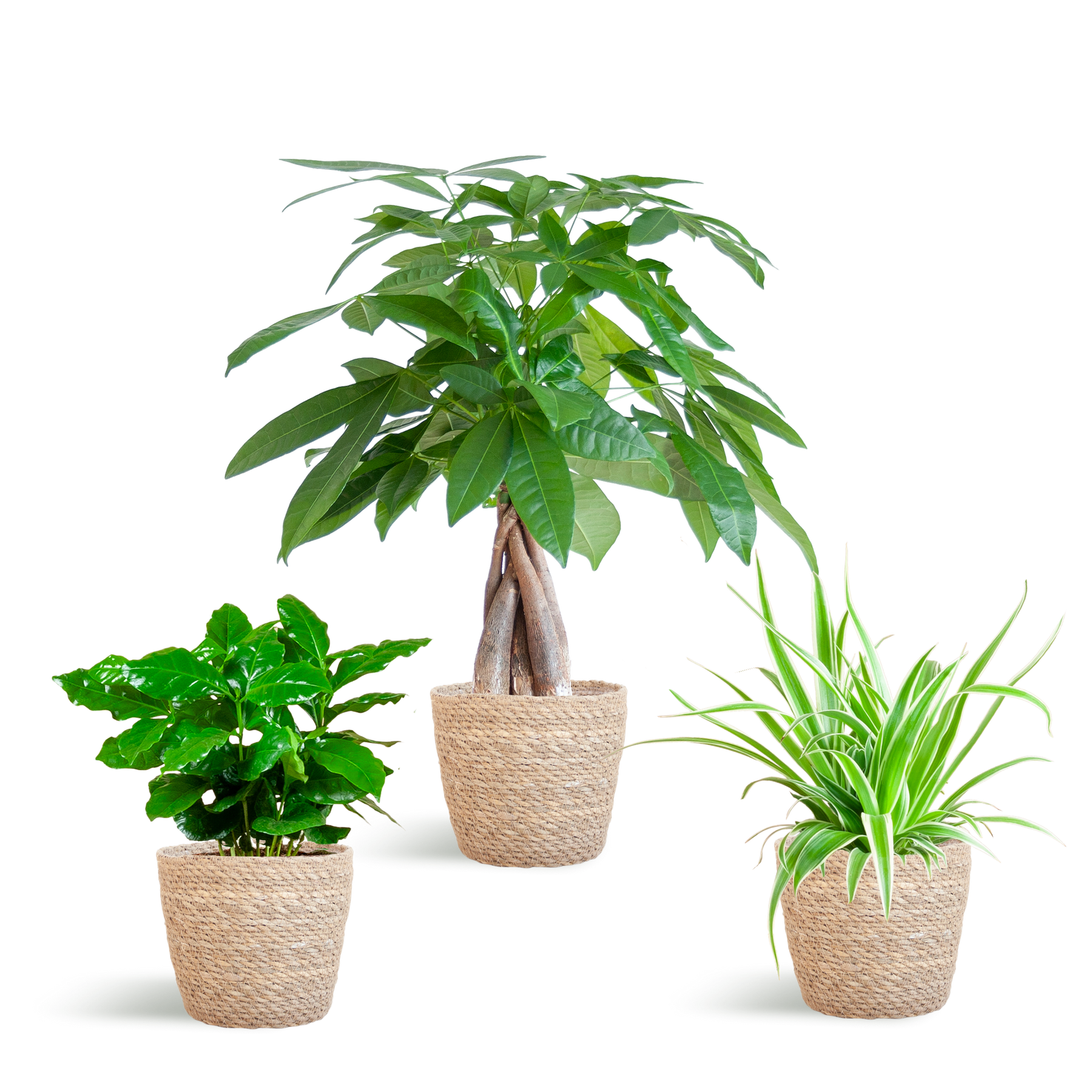 Deze Diervriendelijke Plantenbox bestaat uit een mix van 3 groene kamerplanten. Deze niet-giftige kamerplanten hebben verschillende groottes en bladkleuren. Alle planten in deze box zijn niet giftig voor katten, honden of andere huisdieren. Ook geschikt als je kleine kinderen hebt. Deze kamerplanten kun je zonder zorgen in huis halen! De Diervriendelijke Plantenbox (mix) bestaat uit de volgende kamerplanten: Pachira Aquatica - potmaat 12cm (35 cm hoog) Chlorophytum Comosum - potmaat 12cm (25 cm hoog) Coffea Arabica - potmaat 12cm (20 cm hoog) Deze plantenbox wordt geleverd met 3 x met Mand Sofia naturel. De Sofia plantenpot is gemaakt van zeegras. Dit natuurlijke materiaal wordt gedroogd en gevlochten, met een prachtige plantenpot als resultaat. De Sofia plantenpot is gemaakt van zeegras dat is gedroogd en gevlochten. De pot heeft een plastic inlay, zodat er geen water doorheen kan. De beige kleur geeft deze pot een extra natuurlijke uitstraling, die prachtig is in combinatie met groene kamerplanten.