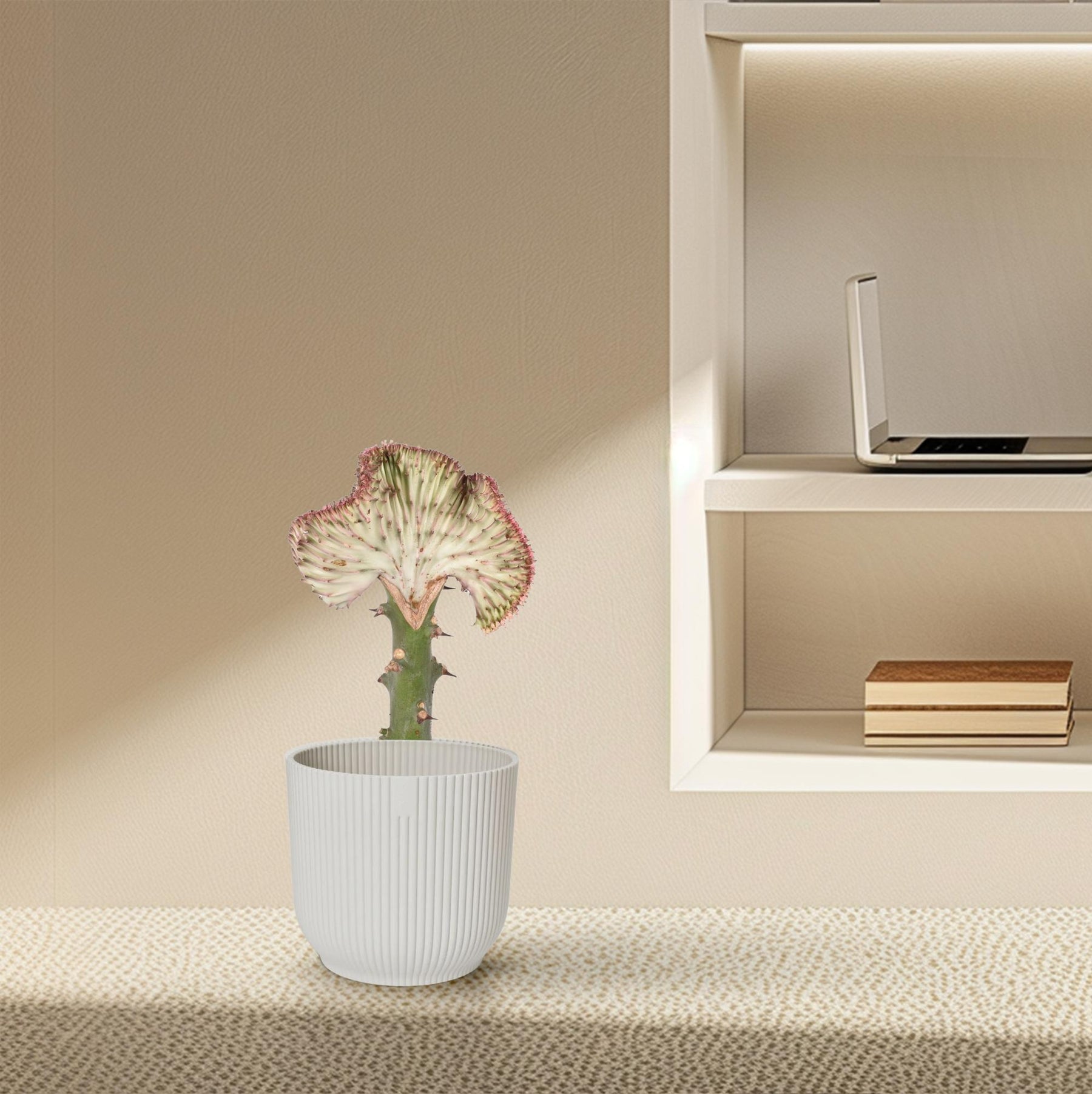 De Euphorbia lactea Cristata, ook wel bekend als de 'Koraal cactussen', heeft een unieke, golfachtige vorm die doet denken aan koraal. Deze helder groene plant kan tot 30 cm hoog worden en heeft dikke, vlezige bladeren die zorgen voor een interessante textuur.