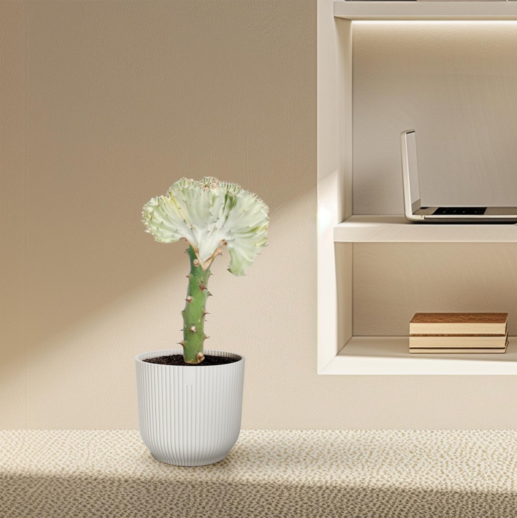 De Euphorbia lactea Cristata, ook wel bekend als de 'Koraal cactussen', heeft een unieke, golfachtige vorm die doet denken aan koraal. Deze helder groene plant kan tot 30 cm hoog worden en heeft dikke, vlezige bladeren die zorgen voor een interessante textuur.