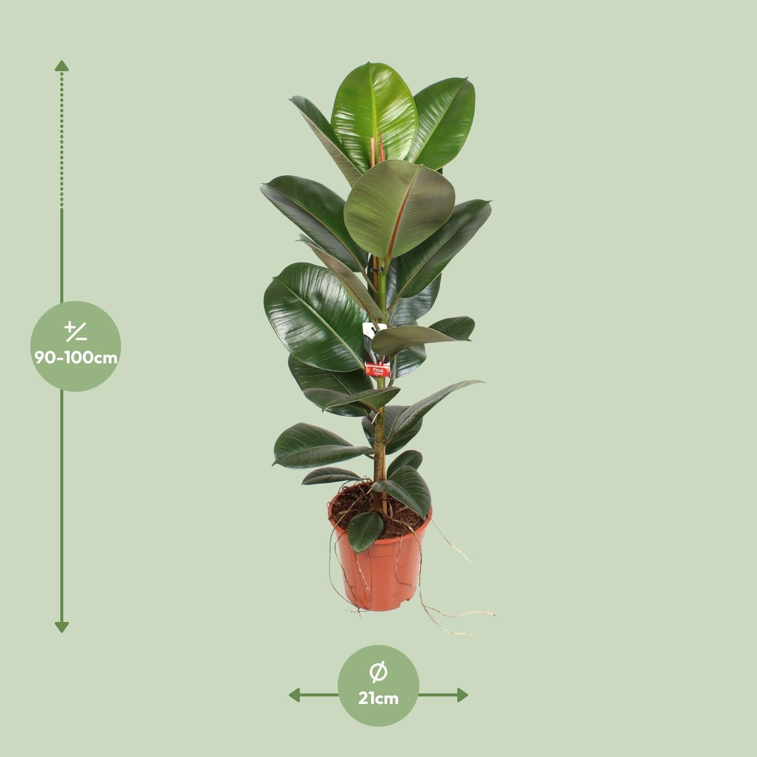 Maak kennis met de Ficus elastica Robusta, een prachtige kamerplant die beter bekend staat als Ficus. Afkomstig uit de tropische regenwouden van Zuidoost-Azië, voegt deze sterke en schitterende plant een vleugje groene elegantie toe aan elke ruimte. Zijn glanzende, rubberachtige bladeren creëren een betoverende aantrekkingskracht en zuiveren moeiteloos de lucht, waardoor het een perfecte keuze is voor binnen. Breng de schoonheid van de natuur naar binnen met deze Ficus elastica Robusta - een heerlijke toevoeging om leven en stijl in uw huis of kantoor te brengen! De Ficus elastica Robusta, ook bekend als de Rubberplant, is een prachtige toevoeging aan elke binnenruimte. Deze veelzijdige kamerplant gedijt goed in helder, indirect licht, waardoor hij perfect is voor een plek in halfschaduw. Met zijn glanzende, donkergroene bladeren voegt het een vleugje weelderigheid toe aan elke hoek. Wat betreft water geven, geeft deze plant de voorkeur aan een normale watergeefroutine. Vermijd het te veel water geven, omdat dit kan leiden tot wortelrot. Met minimaal onderhoud zal deze Ficus elastica Robusta floreren, de lucht zuiveren en natuurlijke schoonheid aan uw huis brengen.Wist je dat Ficus elastica Robusta, ook wel bekend als de Rubberplant, niet alleen een prachtig decoratieve toevoeging is aan elke ruimte, maar ook luchtzuiverende eigenschappen heeft? Deze onderhoudsarme plant, met zijn glanzende, grote bladeren en levendig groene kleur, is een populaire keuze voor binneninrichting. Het is echter belangrijk om te onthouden dat hoewel deze plant esthetische waarde toevoegt, deze niet bedoeld is om te consumeren. Dus geniet gerust van de schoonheid van je Ficus elastica Robusta, maar probeer er niet op te snacken!- Ficus elastica Robusta heeft een potmaat van 21 cm.- De plant groeit tot een hoogte van ongeveer 95 cm.- Ficus elastica Robusta staat ook bekend als Ficus.- Deze plant gedijt goed op een plek met gedeeltelijke schaduw.- Leuk weetje: Ficus planten worden vaak gebruikt als decoratieve kamerplanten vanwege hun luchtzuiverende eigenschappen.