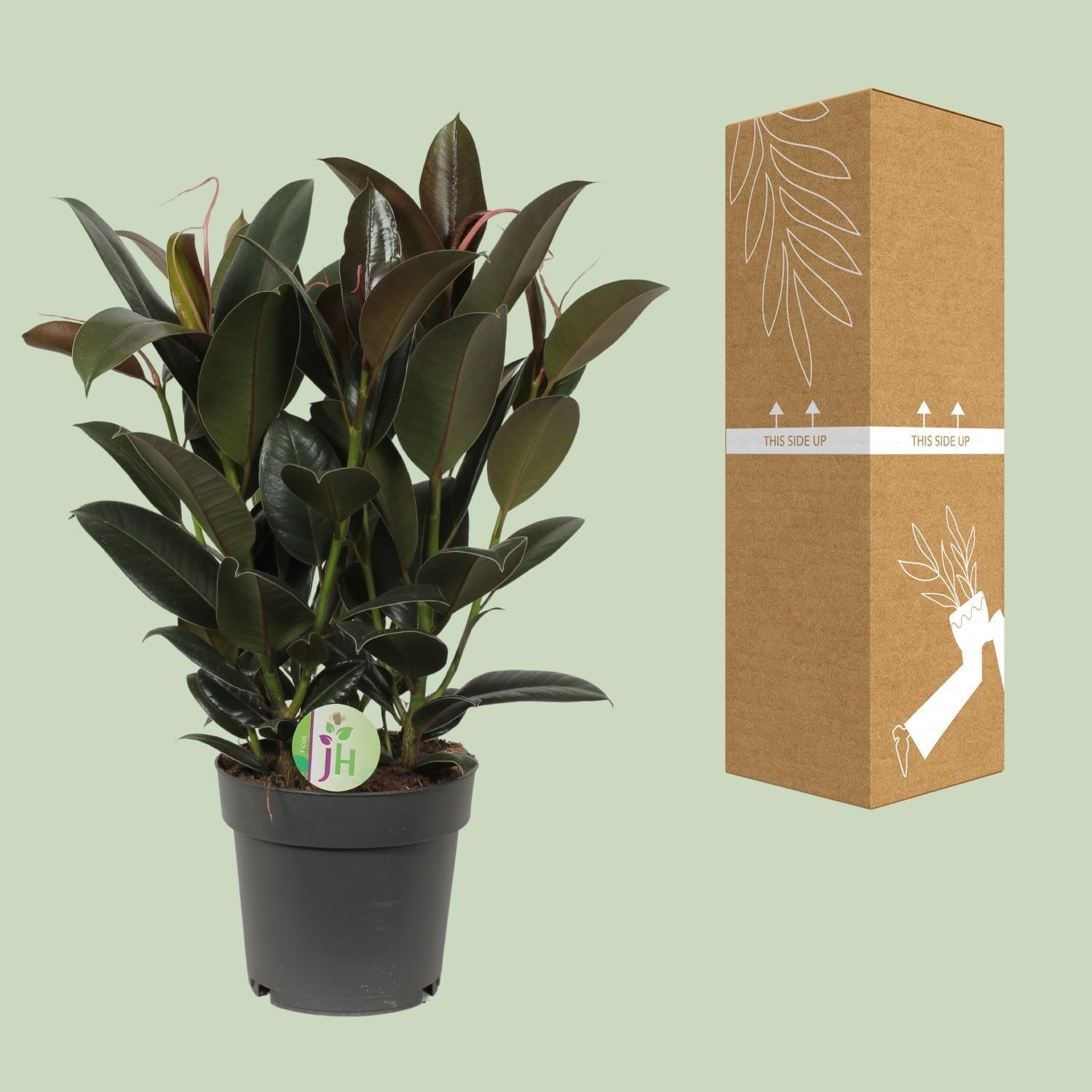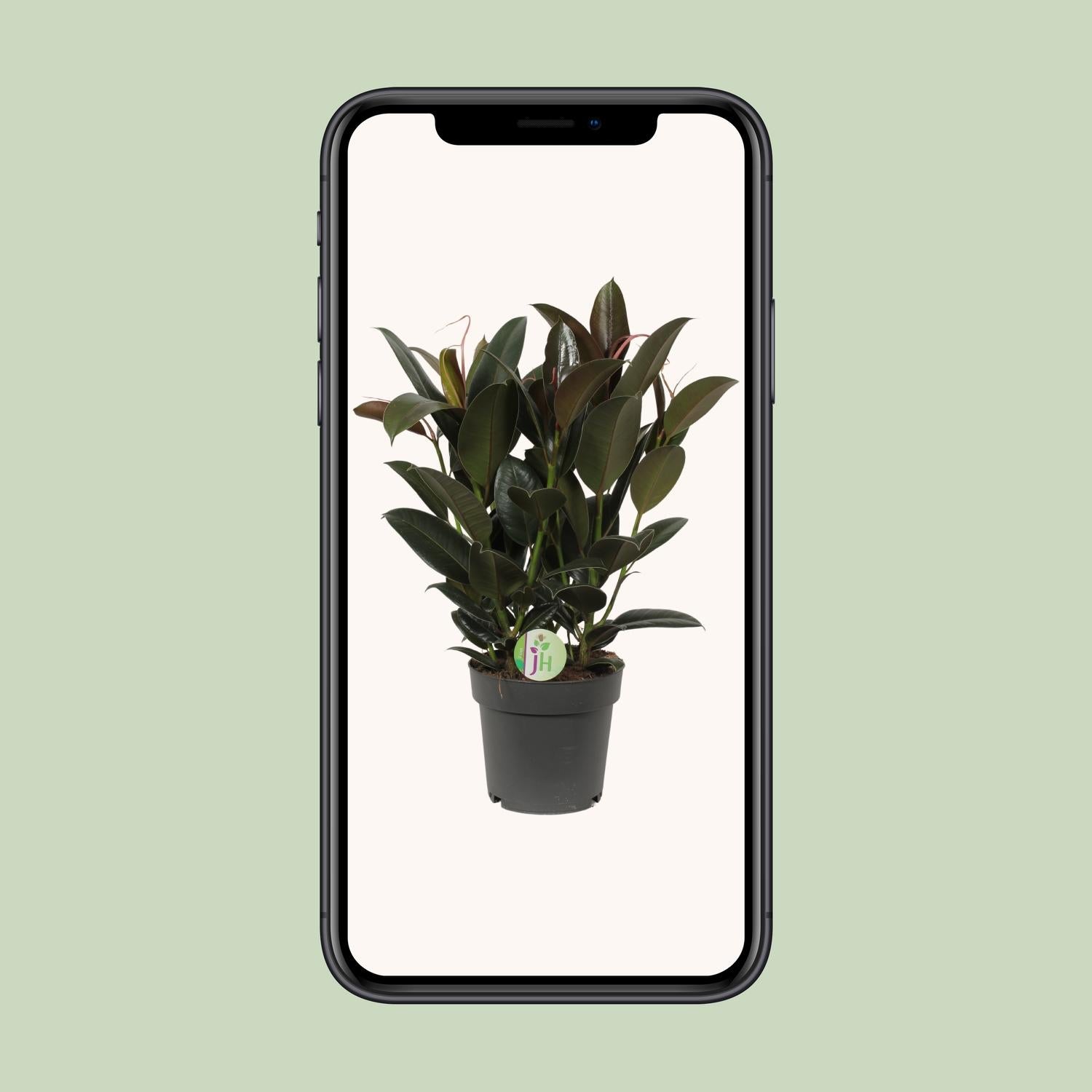 De Ficus Melany (ook wel Ficus melanocarpa genoemd) is een variëteit van de Ficus elastica, ook bekend als de rubberplant. Het is een opvallende kamerplant met unieke kenmerken. De bladeren van de Ficus Melany zijn donkergroen van kleur en hebben een glanzende, leerachtige textuur. Wat deze variëteit onderscheidt, is dat de bladeren een opvallende bronzen tot donkerrode kleur hebben op de onderzijde, waardoor een prachtig kleurcontrast ontstaat. Deze kleurrijke eigenschap voegt een extra visueel element toe aan de plant. Net als andere ficussoorten gedijt de Ficus Melany het beste bij helder, indirect licht. Het vermijden van direct zonlicht is belangrijk, omdat dit de bladeren kan beschadigen. Het kan ook overleven in omstandigheden met iets minder licht, maar dit kan de groei beperken en de kleur van de bladeren verminderen. Wat betreft de waterbehoefte, is het belangrijk om de grond licht vochtig te houden. Laat de bovenste laag van de grond tussen gietbeurten in iets opdrogen voordat je opnieuw water geeft. Zorg ervoor dat de plant in goed doorlatende grond staat, omdat overtollig water kan leiden tot wortelrot. De Ficus Melany gedijt goed bij kamertemperatuur, bij voorkeur tussen 18°C en 24°C. Het is raadzaam om de plant weg te houden van koude tocht of extreme temperatuurschommelingen. Wat betreft voeding kan een evenwichtige kamerplantenmeststof tijdens het groeiseizoen (lente en zomer) worden gebruikt volgens de instructies op de verpakking. In de wintermaanden heeft de plant minder voeding nodig, dus de bemesting kan worden verminderd of stopgezet. Houd er rekening mee dat de Ficus Melany, net als andere ficussoorten, een melkachtig sap bevat dat giftig is voor huisdieren en mensen. Wees voorzichtig bij het hanteren van de plant en houd deze buiten het bereik van nieuwsgierige huisdieren en kinderen. Met zijn opvallende bladkleur en gemakkelijke verzorging is de Ficus Melany een prachtige keuze om een vleugje kleur en stijl aan je interieur toe te voegen.