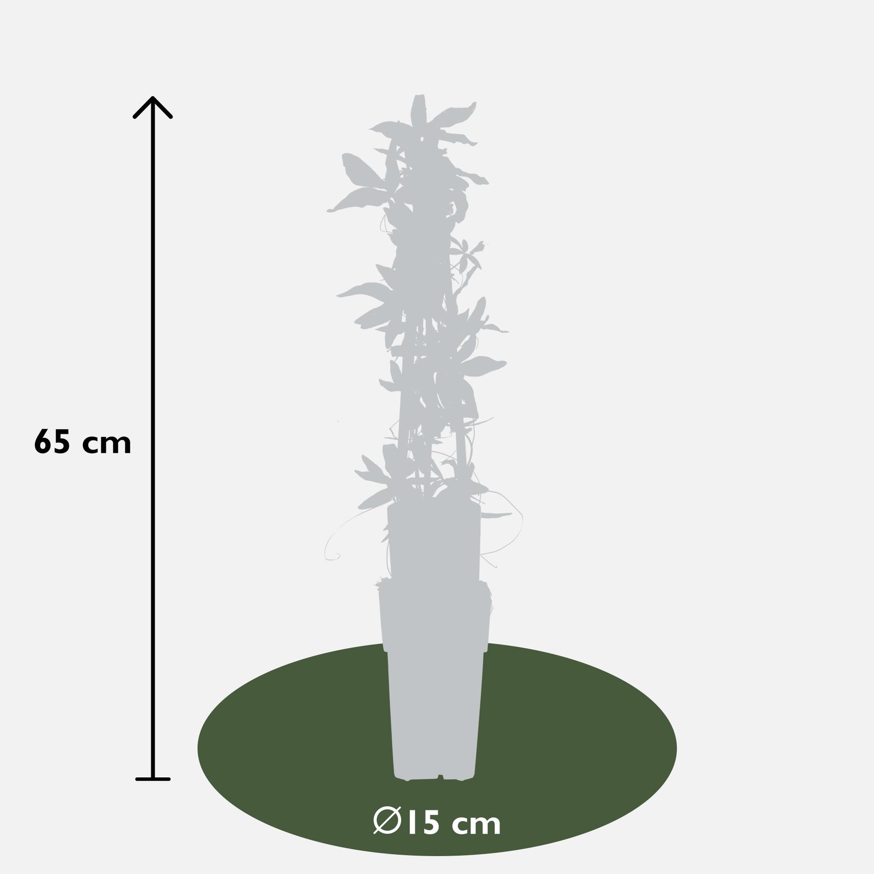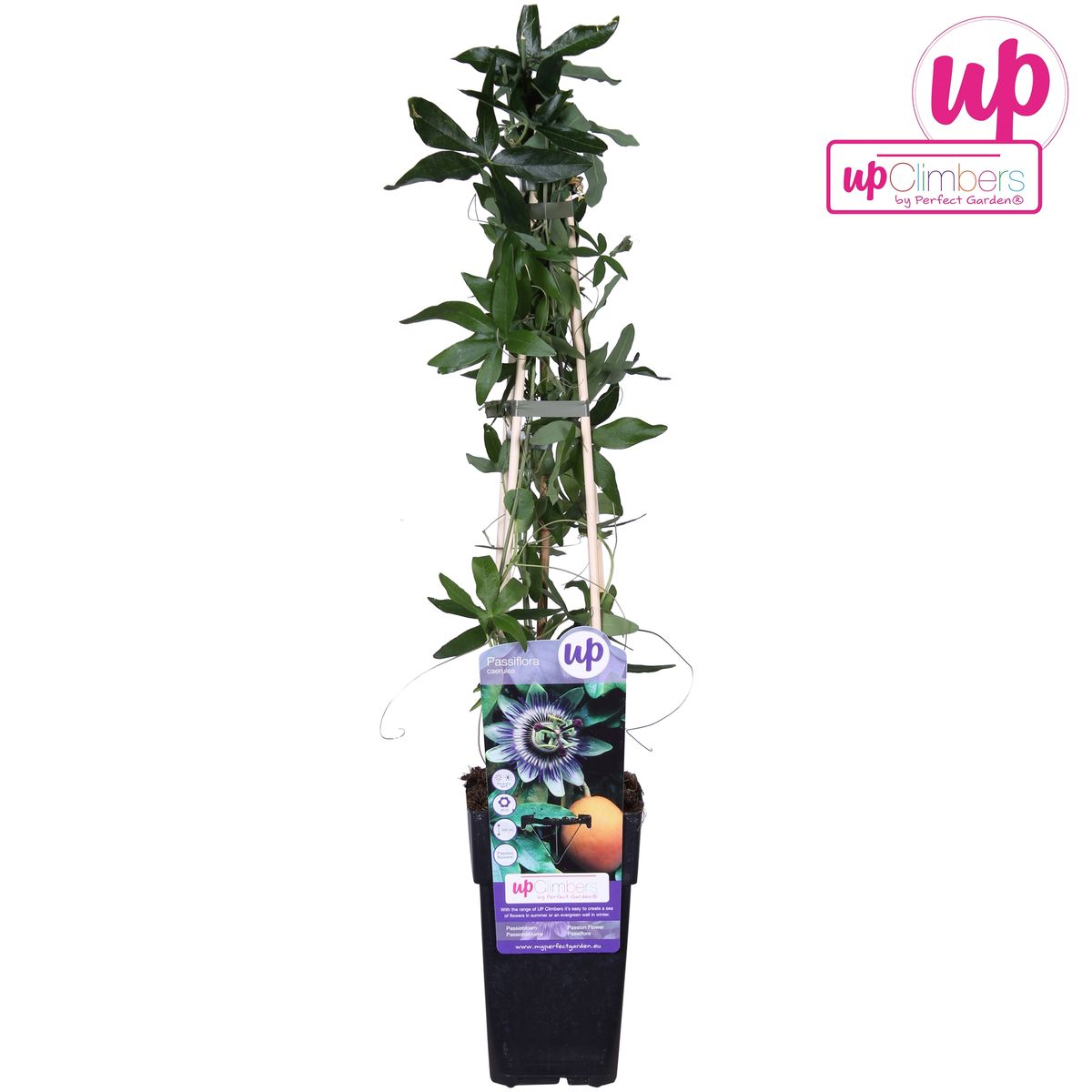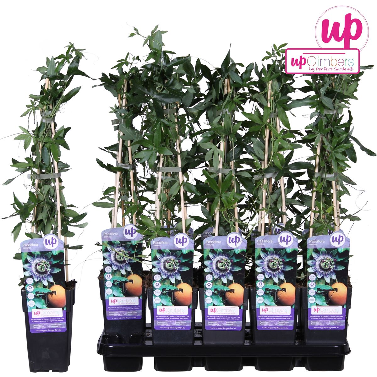 ‘Passiflora caerulea’ is een klimplant met schitterende ivoorwitte-blauwachtige passiebloemen. Dit is de meest bekende soort omdat hij het best geschikt is voor ons klimaat en redelijk winterhard is. Van juni tot september kun je bloemen verwachten in de passiflora. De Passiebloem is een echte mooi weer bloeier. Op warme dagen met veel licht/zon zullen de knoppen open springen. Op wat koudere en donkere dagen zullen er juist weinig bloemen open springen. Het is een echte klimmer en heeft daarom graag wat ondersteuning bij het groeien van een klimrek of schutting.