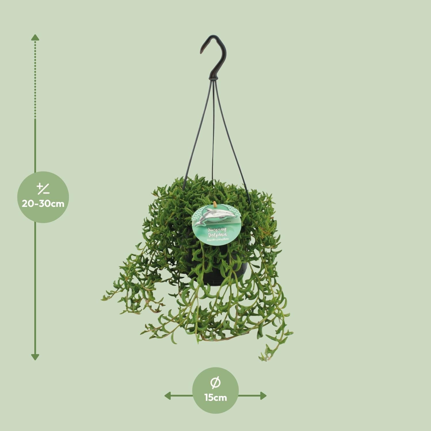 Hier is de Nederlandse vertaling van de tekst:Maak kennis met Senecio Peregrinus, een betoverende kamerplant, ook wel bekend als Cineraria. Met oorsprong terug te voeren naar een kruising tussen Senecio Rowleyanus en Senecio Articulatus, vertoont deze unieke vetplant opvallende gebogen bladeren die lijken op kleine springende dolfijnen. De compacte grootte maakt het perfect voor elke binnenruimte en voegt een vleugje speelse charme toe. Senecio Peregrinus gedijt goed in goed doorlatende grond en heeft matig zonlicht nodig, waardoor het een heerlijke onderhoudsarme toevoeging is aan jouw huis. Breng een vleugje natuurlijke schoonheid binnenshuis met deze SEO-geoptimaliseerde kamerplant, de Senecio Peregrinus of Cineraria. Senecio planten, ook bekend als Cineraria, geven de voorkeur aan een plek in halfschaduw en moeten eenmaal per week bewaterd worden. Ze gedijen goed in goed doorlatende grond met goede vochtretentie. Het wordt aanbevolen om een potgrondmengsel te gebruiken met goede drainage. Meststof moet eens in de twee weken tijdens het groeiseizoen aan de plant worden gegeven, met behulp van een gebalanceerde, in water oplosbare meststof. Het is essentieel om de instructies op de meststofverpakking te volgen om overbemesting van de plant te voorkomen.Senecio Peregrinus, algemeen bekend als de "String of Dolphins," is een fascinerende plant die lijkt op een groep springende dolfijnen. Deze prachtige vetplant is een ongelooflijk gezicht om te aanschouwen en kan een speelse touch toevoegen aan elke kamerdecoratie. Het is echter belangrijk op te merken dat, hoewel Senecio Peregrinus er schattig uitziet, deze aquatische plant niet bedoeld is voor culinaire avonturen. Weersta dus de verleiding om te knabbelen aan deze charmante vetplanten en laat ze jouw leefruimte verfraaien met hun sprookjesachtige aantrekkingskracht!- Senecio Peregrinus, ook bekend als Cineraria, is een unieke en populaire plant met een potmaat van 15 cm.- Deze plant groeit meestal tot ongeveer 25 cm hoogte, waardoor het een compacte en veelzijdige toevoeging is aan elke binnen- of buitenruimte.- Senecio Peregrinus gedijt goed op een plek met gedeeltelijke schaduw, waardoor het geschikt is voor plaatsing in gebieden met indirect zonlicht of gefilterd licht.- Bovendien staat deze plant bekend om zijn interessante bladeren die lijken op dolfijnen die uit golven springen, wat hem de bijnaam "Dolphin Necklace" heeft opgeleverd.- Het toevoegen van een Senecio Peregrinus aan je plantencollectie zal niet alleen zorgen voor een visueel aantrekkelijke esthetiek, maar ook voor een vleugje speelsheid en speelsheid.